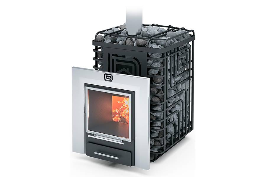 Чугунная печь для сауны с прозрачной дверцей, позволяющей видеть пылающий огонь. Конструкция имеет грамотно продуманную топочную систему, что дает возможность повысить температуру стенок. Это повышает эффективность и снижает расход топлива.