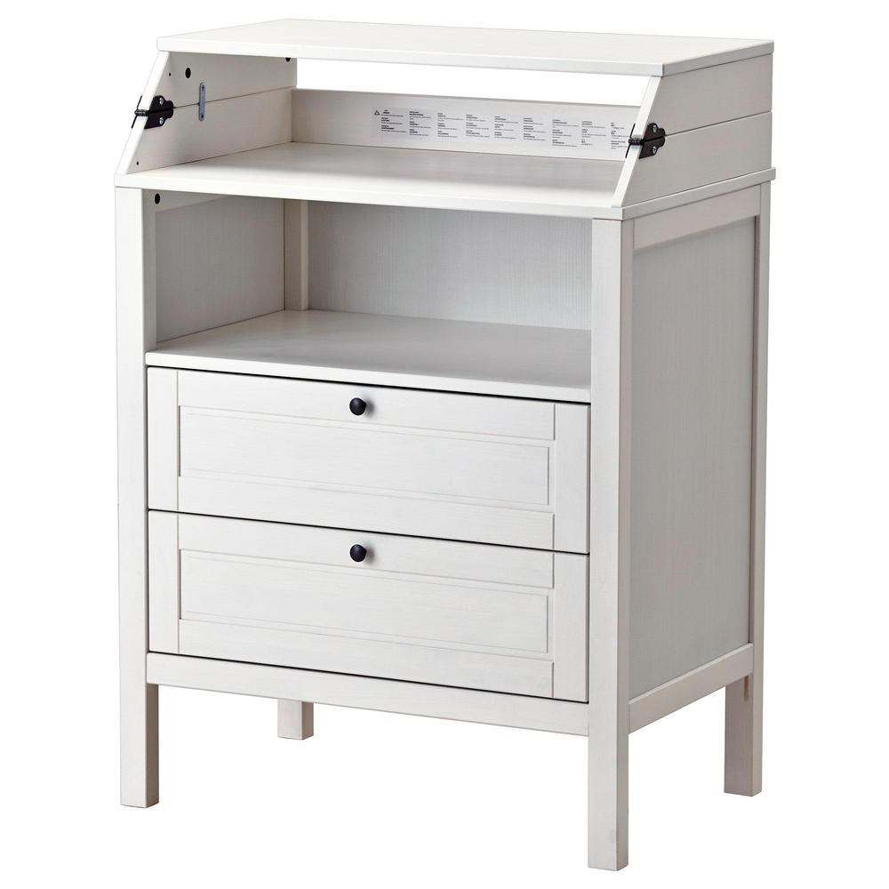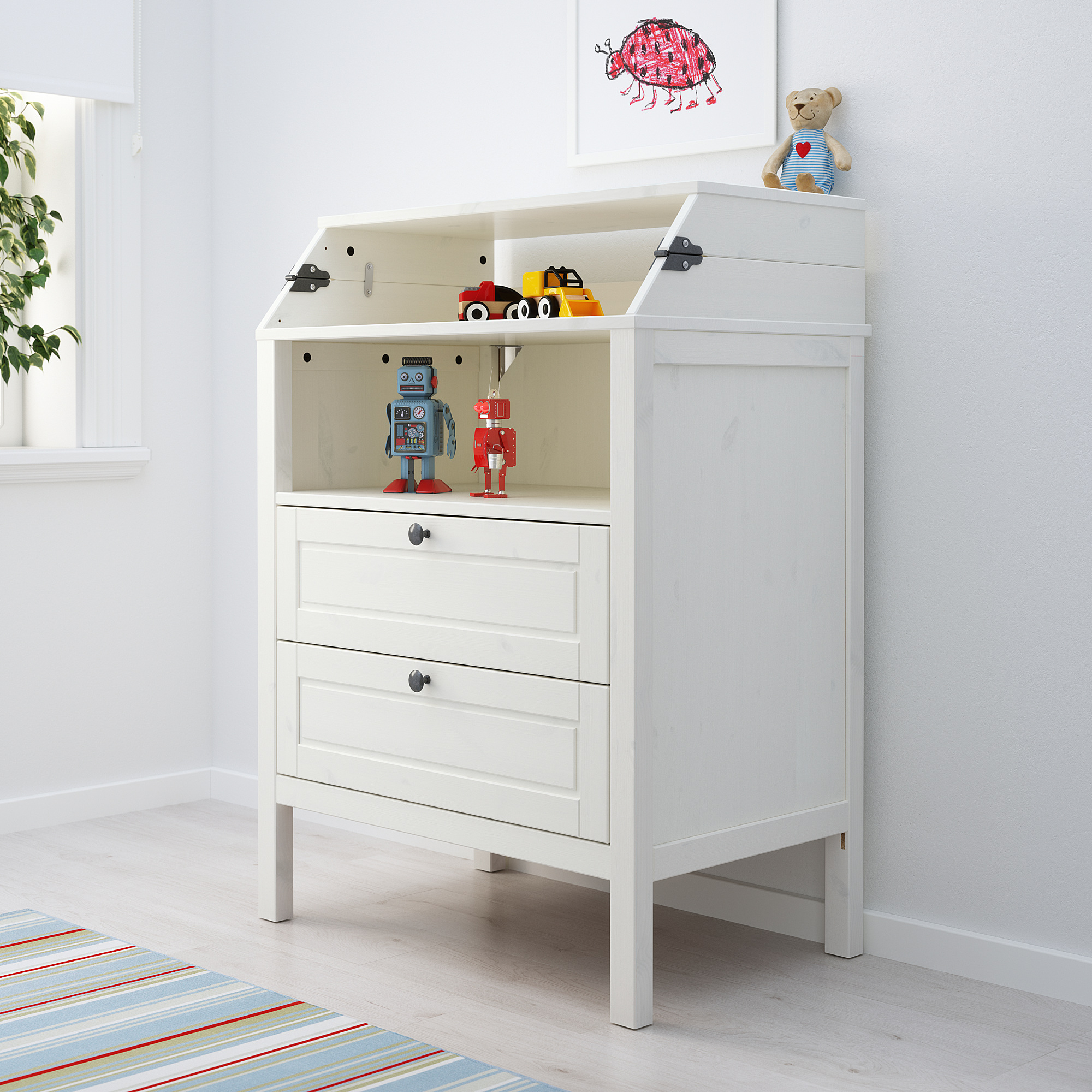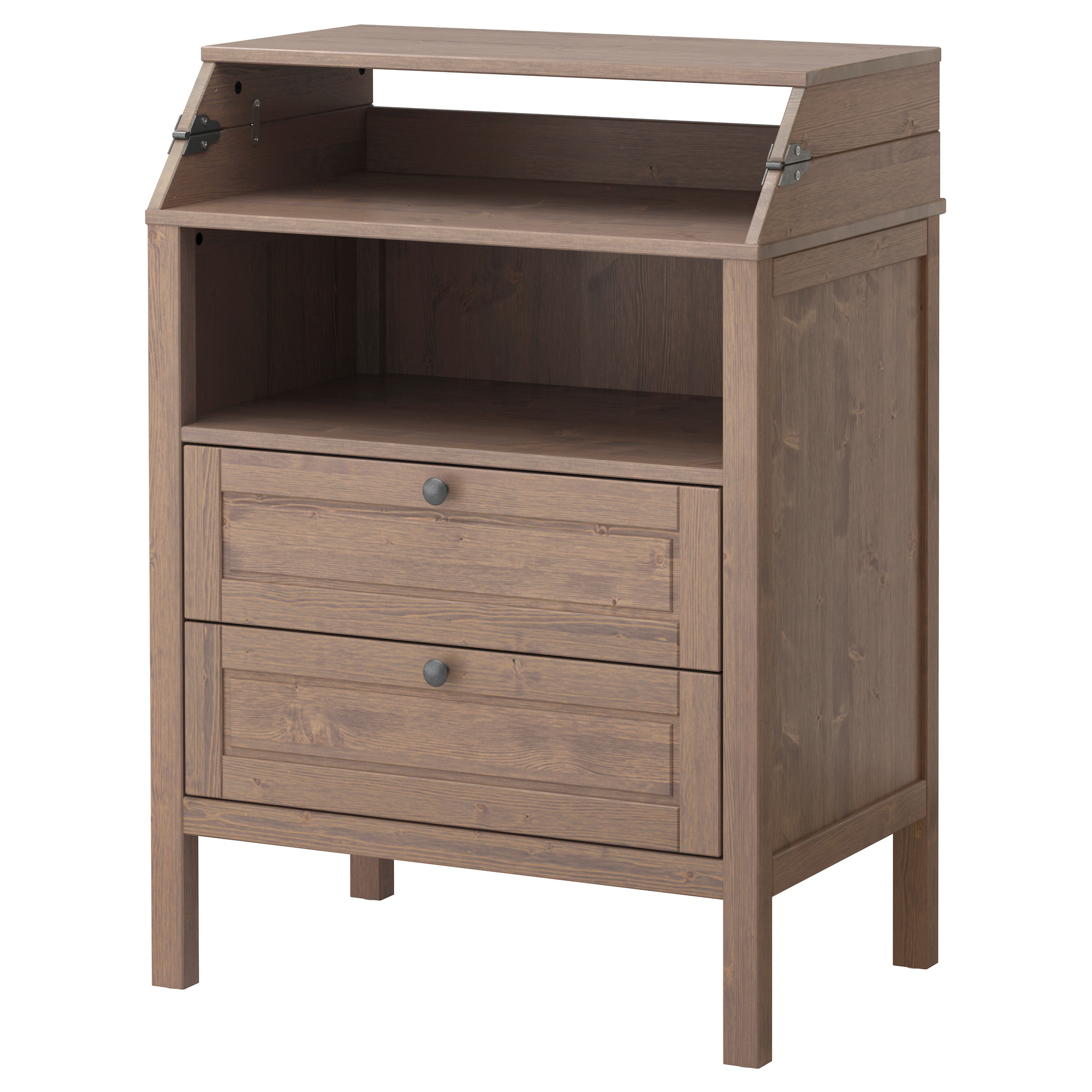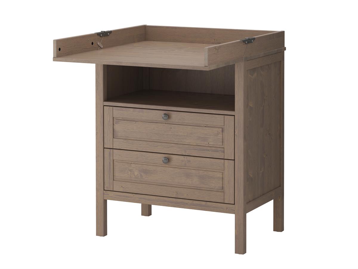 Другая модель комода с пеленальной поверхностью – «Сундвик», более вариативна по размерам. Можно приобрести изделие, имеющее ширину 79 см и глубину 51 см, хотя можно заказать и более объёмный вариант, имеющий глубину 87 см. Высота изделия также может быть выбрана покупателем по собственным предпочтениям, от минимальной в 99 см до максимальной в 108 см.