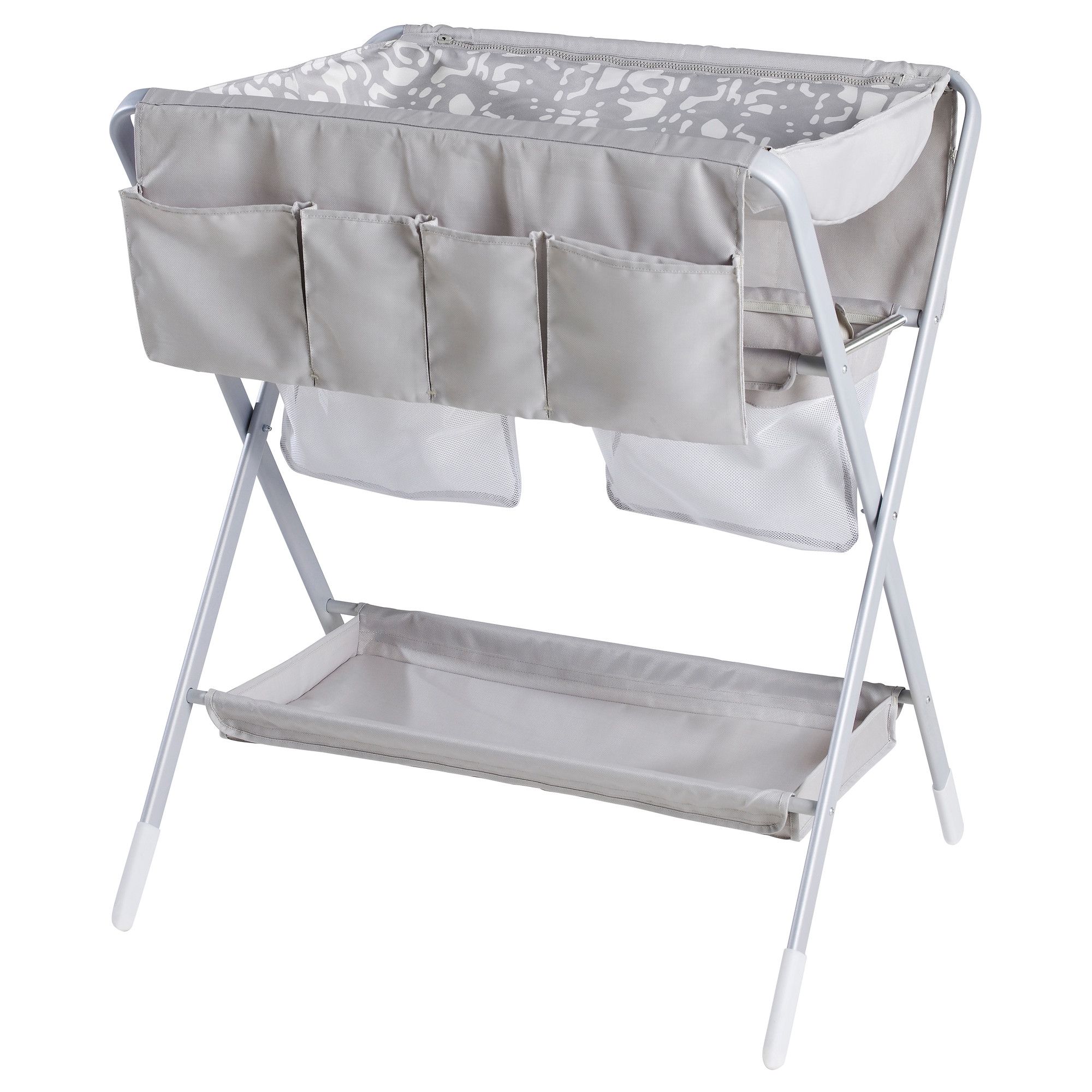 Подобные модели выполняют свою функцию отлично: на столике мама проводит все манипуляции с ребенком, а необходимые для гигиенических процедур предметы хранит на одной или двух полках, которые расположены под столешницей. Складные столики могут иметь и ванночку для купания, встроенную под съемной столешницей.