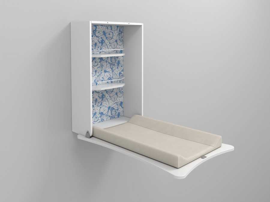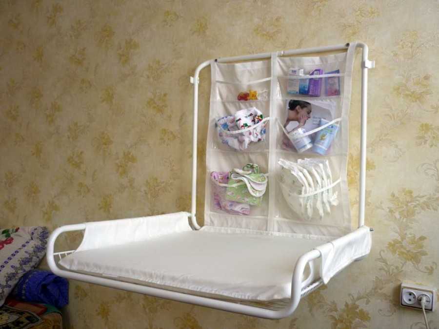 Стол крепится к вертикальной поверхности и за счет этого не занимает много места. Как и любое другое пеленальное приспособление, он снабжен бортиками и мягкой поверхностью. Снизу могут находиться кармашки для хранения подгузников и других мелочей.