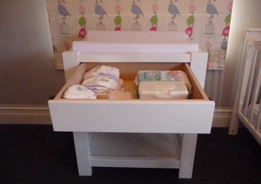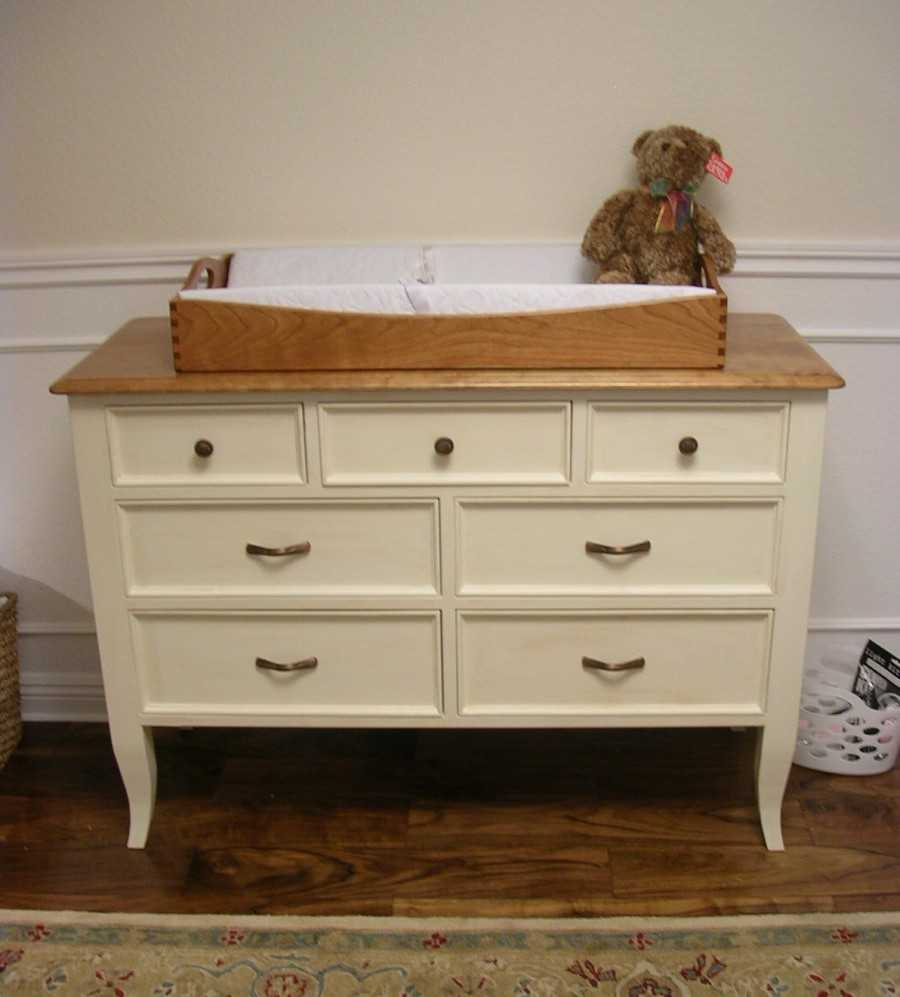 Если в детской уже стоит обычный шкафчик небольших размеров, его можно дополнить самостоятельно изготовленной накладкой-столиком. Для реализации задачи понадобятся пиломатериалы высокого качества и грамотно построенные чертежи изделия. Если же у человека за плечами большой опыт работы с деревом, даже изготовление целого пеленального комода своими руками не вызовет у него сложностей.