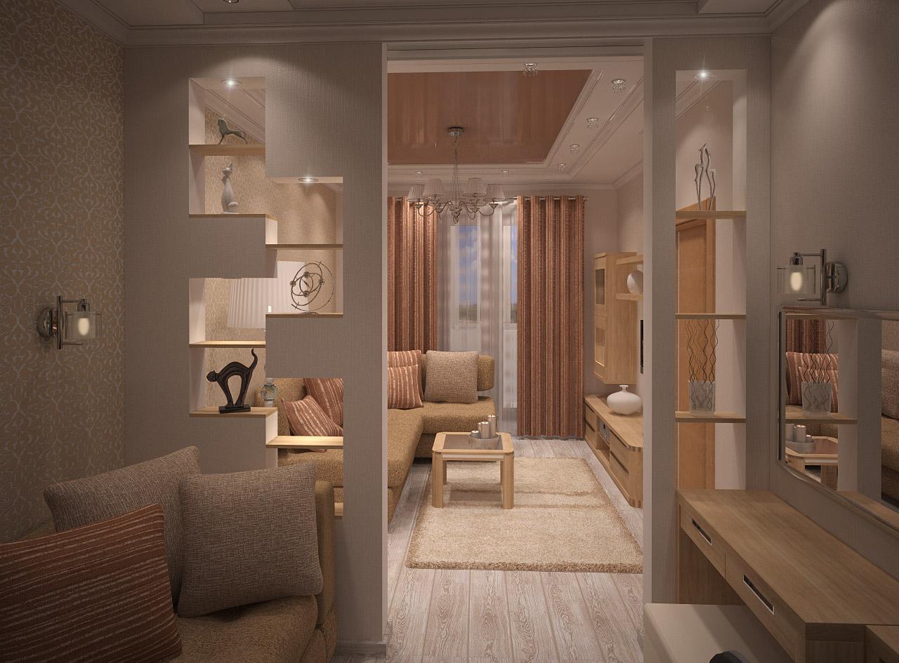 В одной комнате совмещены гостиная и спальня, чтобы подчеркнуть разное назначение частей пространства, она поделена на две равные часть вспомогательной перегородкой. При этом сохраняется общность пространства. Отделка возведённой стены в классическом стиле дополняет декоративную атмосферу интерьера.