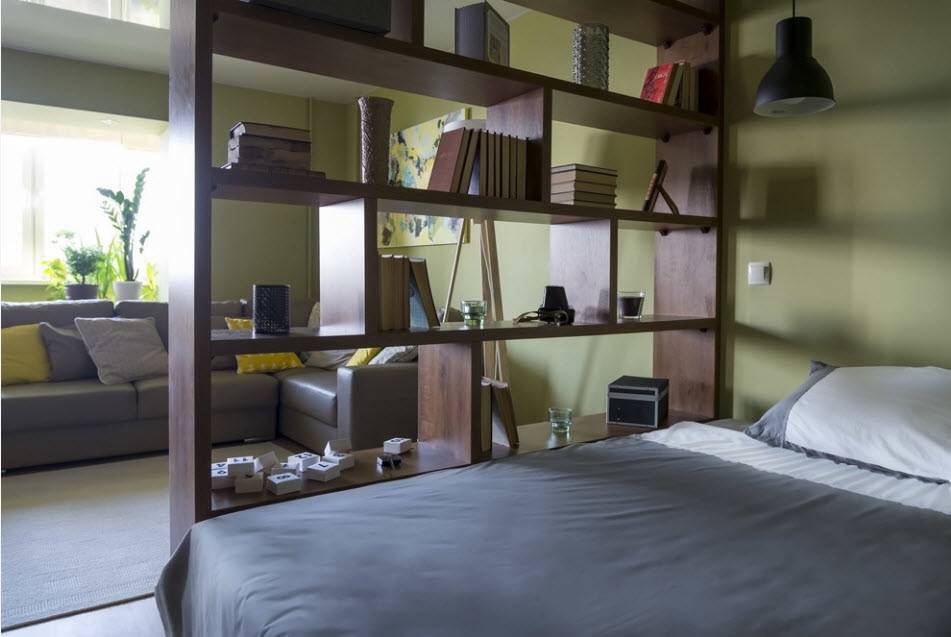 Спальня и гостиная разграничены стеллажом-перегородкой