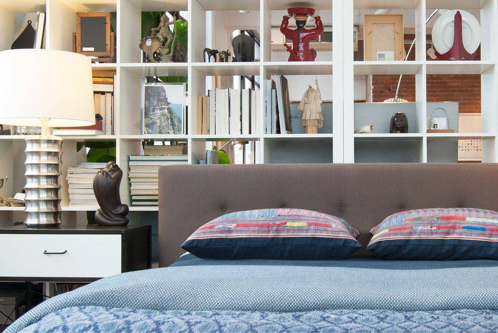 Любая зонирующая конструкция является препятствием на пути естественного света. Один из вариантов решения проблем с освещением – использование прозрачного стеллажа. Именно так и поступил дизайнер в процессе зонирования студии, он отделил кровать белым стеллажом, которым можно пользоваться с обеих сторон.