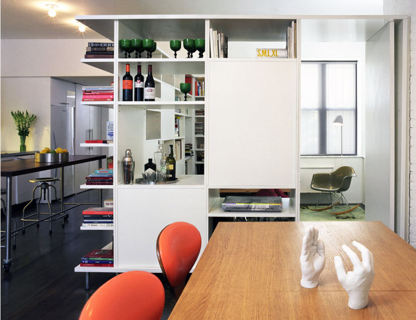 Приведем несколько примеров функционального использования стеллажа-перегородки с точки зрения зонирования пространства.
