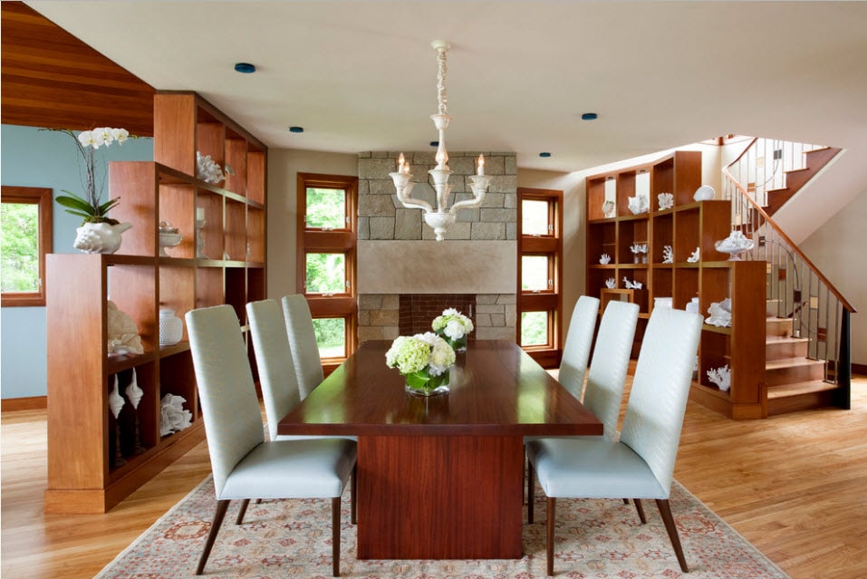Данная конструкция может быть сплошной, резной, высокой от пола до потолка или низкой. Для изготовления перегородок применяются самые разнообразные материалы в виде дерева, пластика, ткани или высокопрочного стекла. Оригинально выглядят зонирующие элементы с бамбуковыми прутьями, деревянными балками или канатами. Подобные изделия отлично вписываются в интерьер дома или квартиры в стиле кантри, шале, прованс или минимализм.