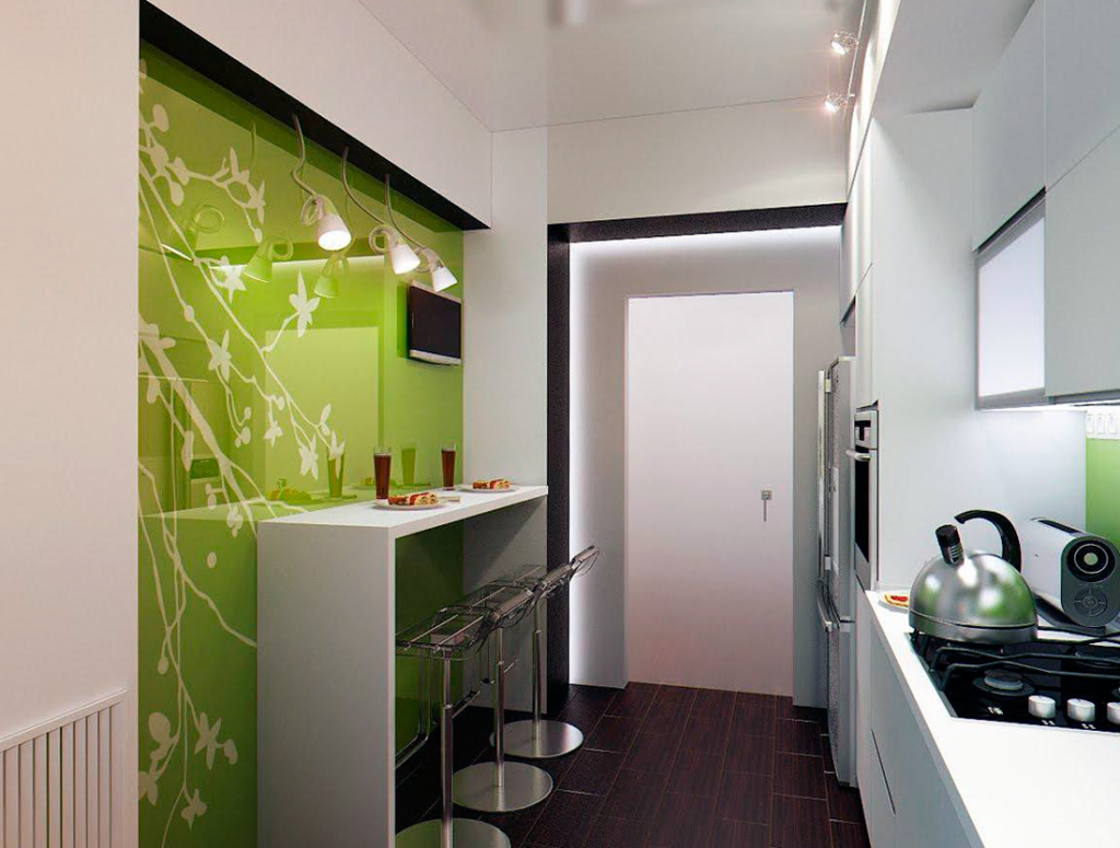 Для визуального расширения пространства, кухня в коридоре должна освещаться равномерно. Для вытянутого помещения не подойдет одна центральная люстра, поскольку она зрительно уменьшает площадь. По периметру потолка встраивают точечные светильники, а стены украшают несколькими бра.