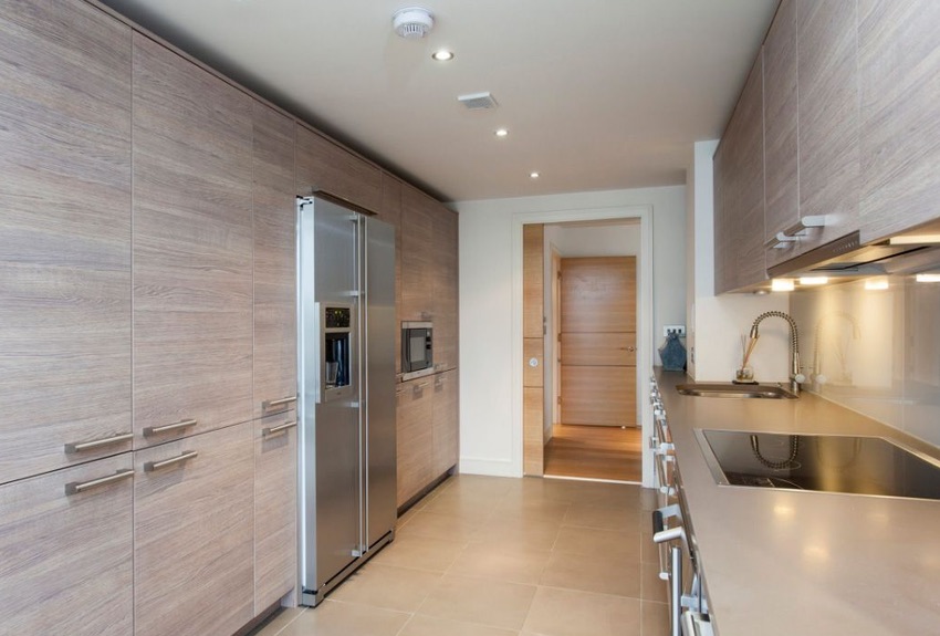 При необходимости организации места отдыха в объемной кухне-коридоре разумно опираться на принципы минимализма. Ничто не должно мешать расслаблению окружающих. Поэтому стоит меблировать пространство кухонной техникой встраиваемого типа, гарнитуром с дверьми, маскирующими внутреннее наполнение (мойку, плиту, вытяжку). Если габариты площади позволяют установить объемные детали интерьера, то обязательно организуйте каминную зону.