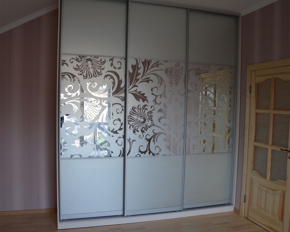 Чаще применяется нанесение матового узора на зеркальном фоне. Украшенные в подобном стиле шкафы выглядят элегантно и сдержанно. Подходят для жилых помещений, офисов, косметологических кабинетов. Локализация декора бывает разной. От частичного украшения снизу и сверху полотна, заканчивая равномерным заполнением всей дверной поверхности. Весь технологический процесс происходит с внутренней стороны зеркала.