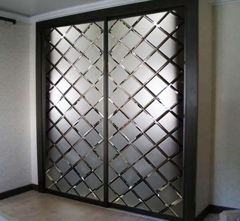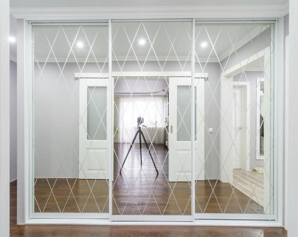 Второй метод отделки представлен применением обратного эффекта — формированием узора на матовой основе. Создание изображения происходит за счёт удаления заднего слоя зеркала в местах, где должен быть матовый фон. После матирования створка обретает полупрозрачный вид. Наиболее выгодно смотрятся узоры на длинных купейных конструкциях из 3 дверей и более. Пример популярного принта для шкафа в коридоре — ромбы из зеркал на матовом полотне.