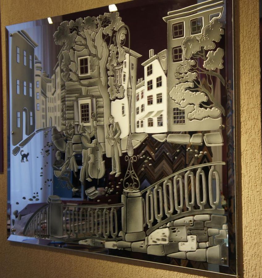 Пескоструйная гравировка (резка). Эта технология создаёт светлое и четкое изображение, с подробной прорисовкой небольших деталей. Эта технология прекрасно подходит тем, кто желает оформить интерьер поверхностью из зеркала с великолепным, объемным и правдоподобным изображением.