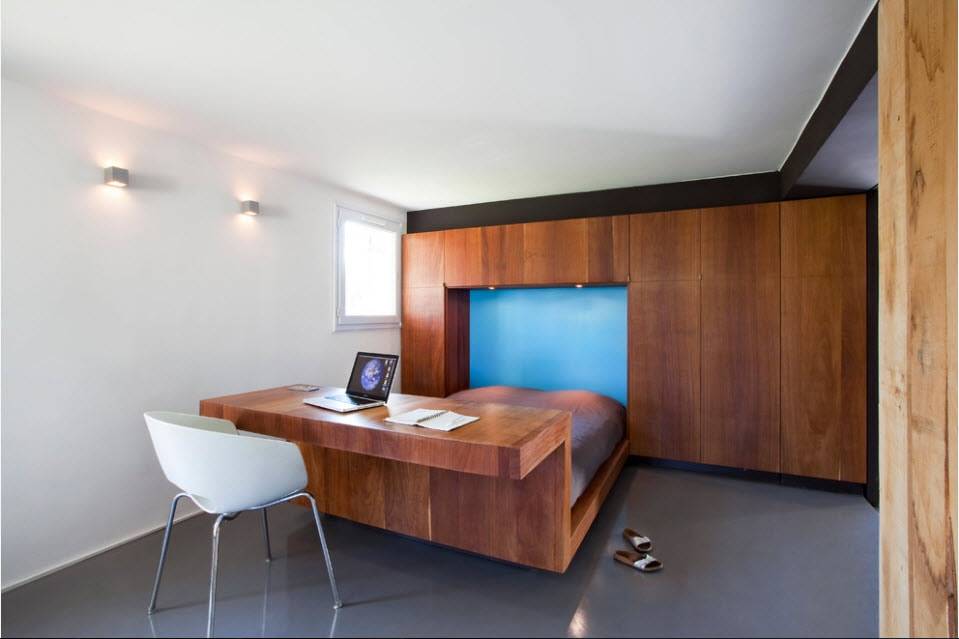 Существуют системы «кровать-чердак». Под постелью располагается стол. В итоге получается детский мини-кабинет.