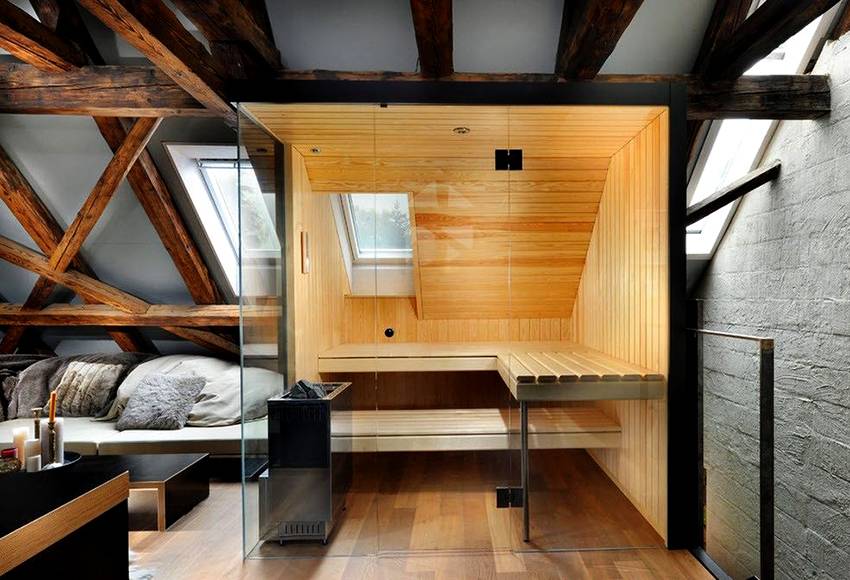 - Мансарда позволяет не только эффективно использовать строительную площадь, но и размещать приехавших на дачу гостей. Первый этаж оборудуем предбанником, «залом», моечной и парильным отделением, а второй обустраиваем под жилое помещение. Чтобы создать гостям комфортные условия, зонируйте мансарду на спальню и место, где они смогут насладиться всеми прелестями деревенской жизни.