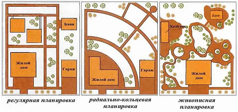 Основная дорожка, проложенная через весь участок, делит территорию на 2 равные части, и все объекты, расположенные по обе ее стороны, располагаются симметрично. Несимметричные линии можно располагать по периметру.