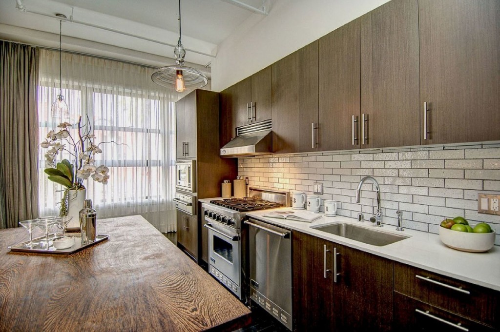 Очень необычно будет смотреться стиль лофт. Имитация белой кирпичной кладки на стенах в сочетании с темными фасадами мебели превратят старомодное помещение в изысканную и современную кухню.
