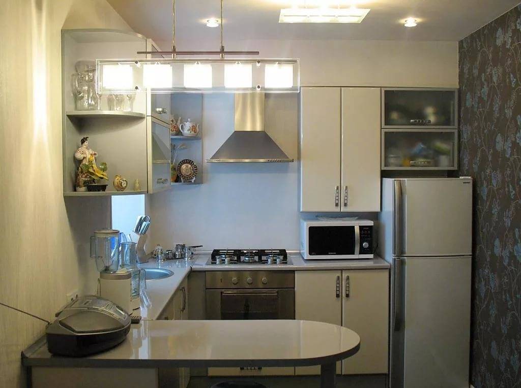 Но так как это редкость, обустроить кухню нужно с максимальной рациональностью и экономией свободного пространства. Для удобства можно разместить небольшой мягкий уголок.