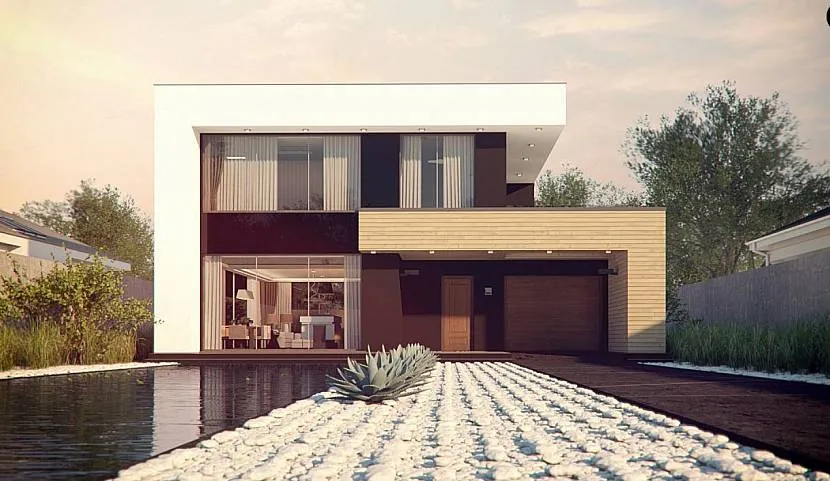 Оригинальный, а самое главное – стильный и современный дом, относящийся к стилю хай-тек. Огромные, во всю стену, панорамные окна, зал для занятия тяжёлой атлетикой или фитнесом на первом этаже. Преимущества планировки двухэтажного дома в следующем: