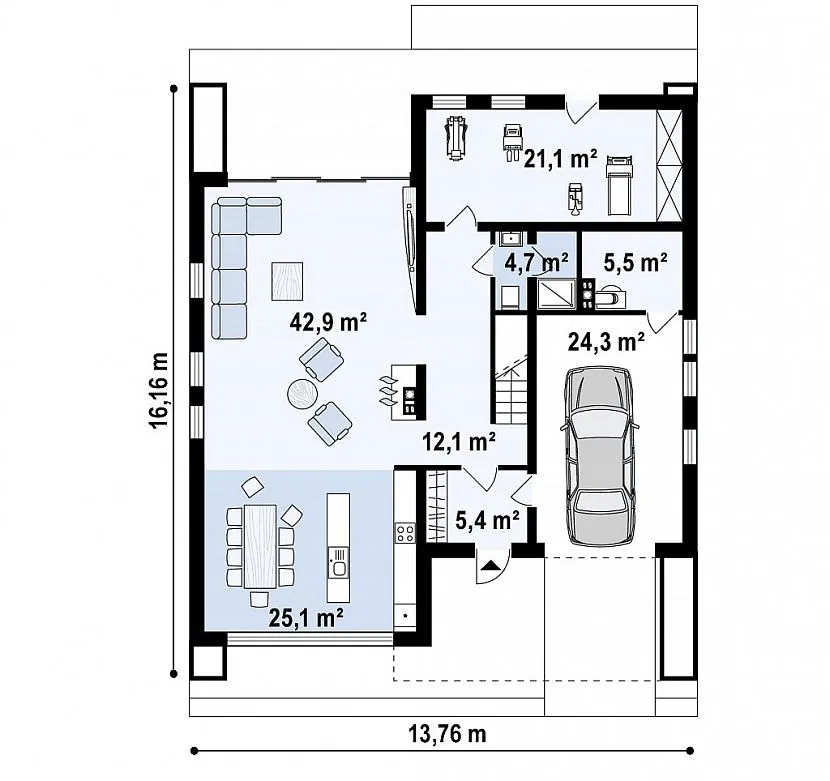 Общий план дома по типовому проекту «Matas»: тамбур+прихожая — 13,3 кв. м; гостиная — 16 кв. м; кухня- 13,3 кв. м; гостиная- 32,4 кв. м; гараж — 21,2 кв. м; котельная — 6,3 кв. м; санузел 8,1 кв. м; спальня — 14,6 кв. м