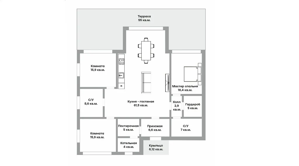 Так выглядит проект дома площадью 148,9 кв.м.: в комнатах разделены детская зона и родительская, есть выход на террасу с гостиной, предусмотрена постирочная и котельная.