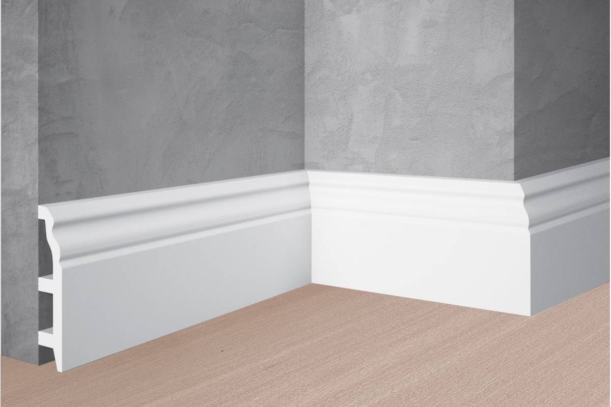Полиуретановые молдинги являются популярным элементом декора между полом и стеной. Широкий плинтус выполняет специальную декоративную функцию, но также несет функцию украшения пола, независимо от его цвета. Полиуретановый молдинг прекрасно реагирует на покраску почти всех известных красок. Материал изготовления позволяет использовать его не только в сухих помещениях, но на кухне и в ванной комнате. Если вам нужно очертить кривые поверхности, то можете слегка согнуть декоративный элемент и даже создать криволинейную линию. Вторичная, но не менее важная задача по отделке напольного плинтуса из полиуретана — это размещение коммуникаций, проходящих вдоль пола. Полиуретан — нетребовательный материал, который:
