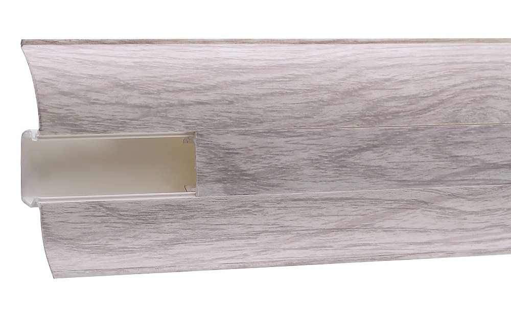 Еще один доступный вариант, который предлагает многообразие вариантов отделки. Одно из ключевых достоинств — неспособность материала впитывать воду и служить основой для размножения плесени. По этим причинам ПВХ-плинтус рекомендуется использовать в ванной и других помещениях с высокой влажностью. Будучи довольно гибким такой плинтус уживется с не идеально ровными стенами. Определенным недостатком можно считать его хрупкость.