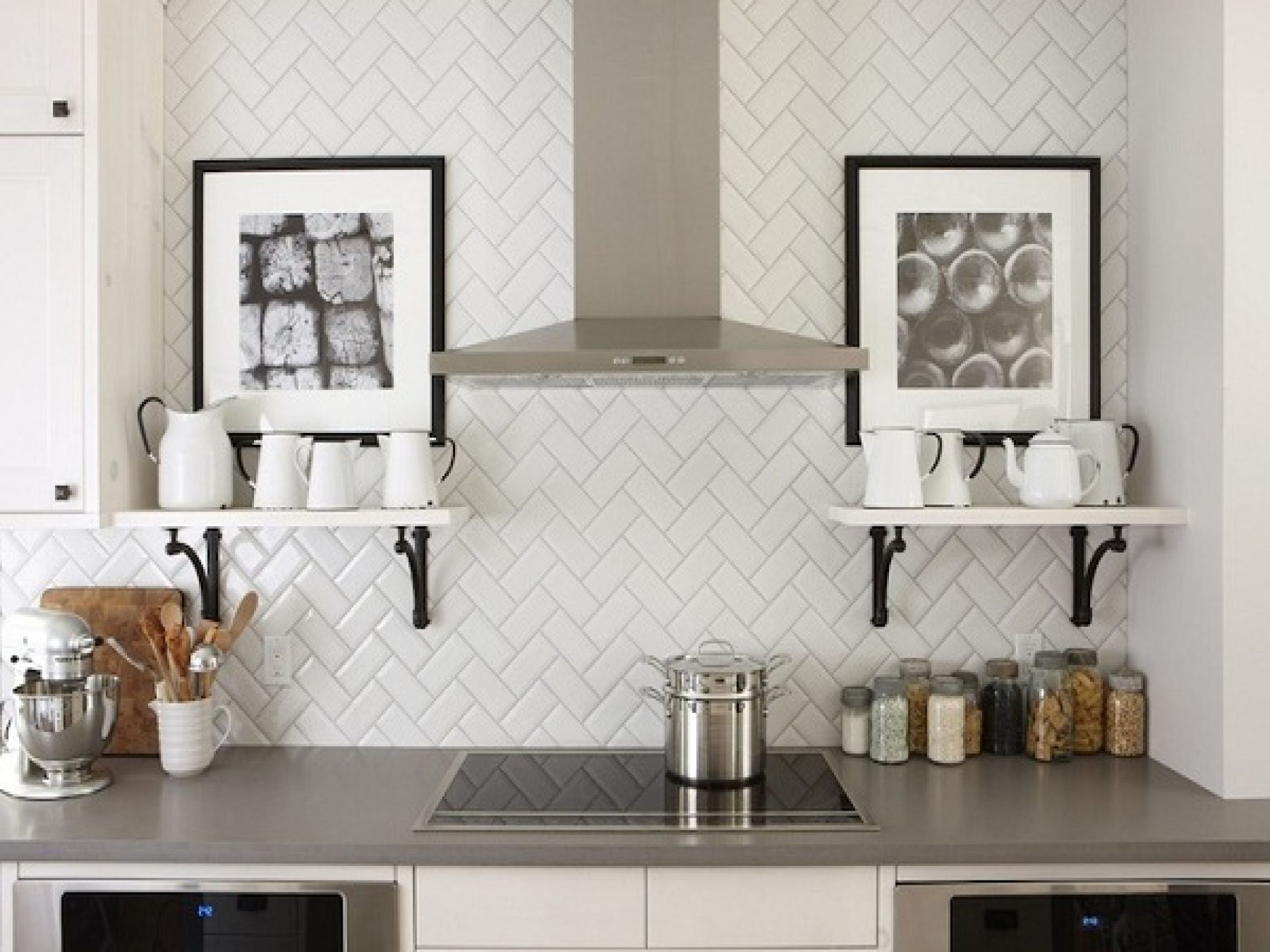 Отделка кухонных стен белой плиткой «кабанчик» в форме ёлочки