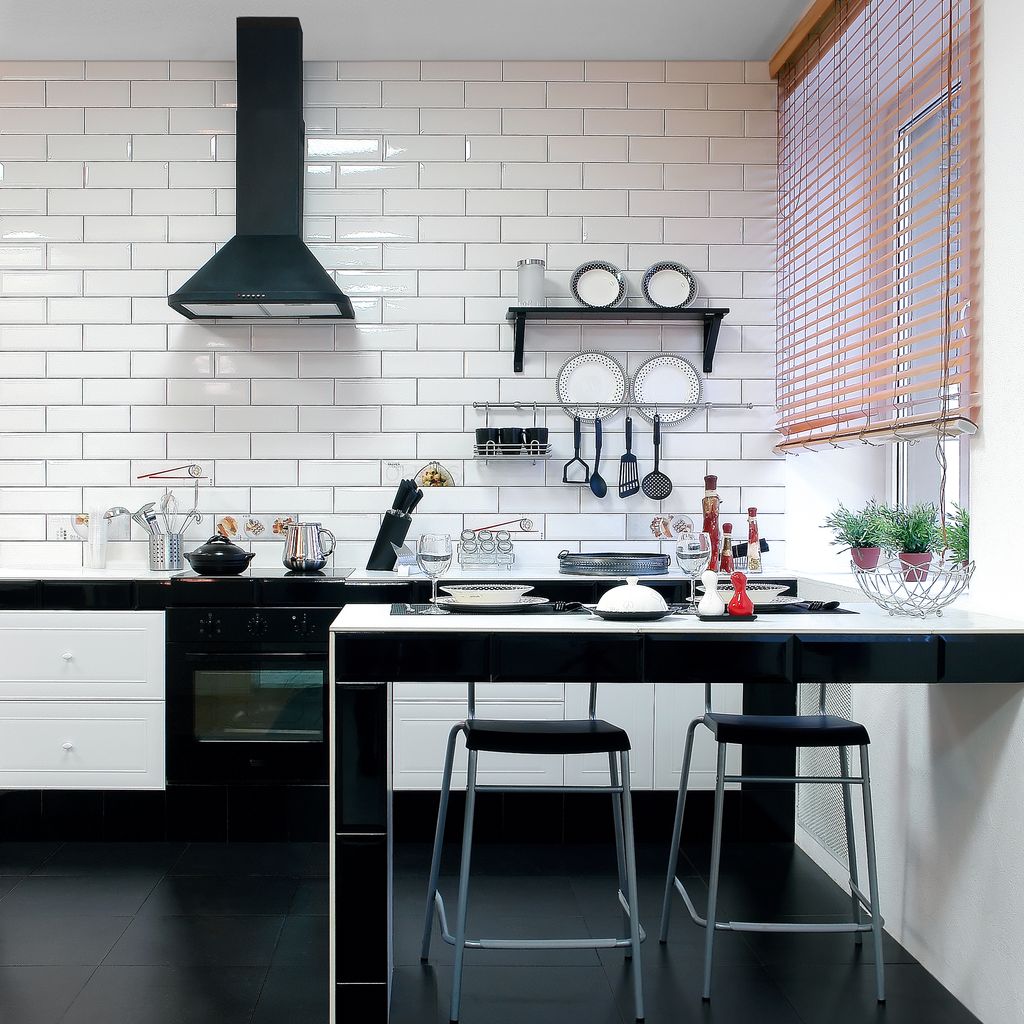 Черная плитка “кабанчик” смотрится на кухне необычно, но выигрышно.