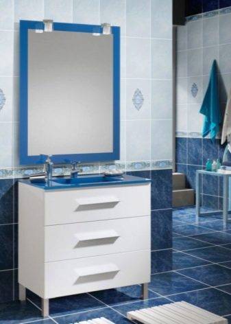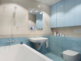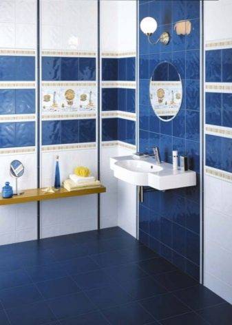 Сейчас многие профессионалы применяют разное сочетание. Вот один из примеров: пол желательно сделать полностью синим, а стены оформить сине-белыми полосами, словно оклеенными обоями. Это придаст красоту вашему интерьеру, но данный эффект довольно противоречив. Войдя в такую ванную, вы сразу же окажитесь на дне моря, где с вами заиграют водяные потоки. На подсознательном уровне возможно появление тревоги.