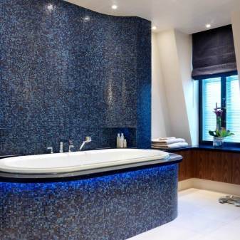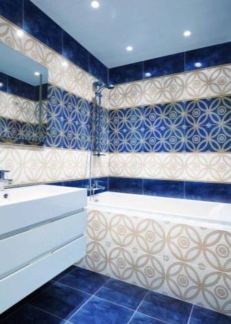 Решив разбавить синюю плитку разными узорами, вы создадите необычайные стили в вашей ванной. Так можно избавиться от обилия темной краски, способной развить депрессию, при этом сделать пространство интересным. В зависимости от типа рисунка можно использовать разные приемы. Однако основным, доминирующим должен оставаться именно синий цвет. При этом он может быть мягким, приглушенным, даже разбавленным белым.