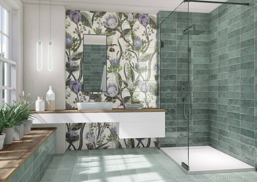 Тенденция стремления к натуральности прослеживается и в выборе цветовой гаммы для коллекций плитки. Оттенки терракоты и морской воды, листвы, мха, камня актуальны во всех проявлениях.