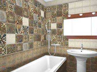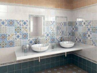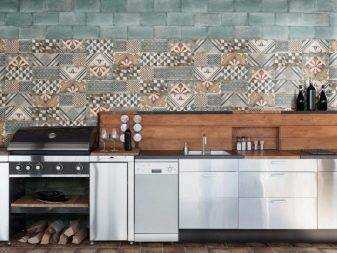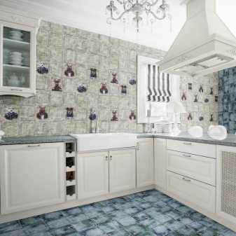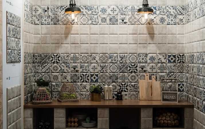 Нельзя обойти стороной и такой популярный вид, как пэчворк. Плитка с мотивами тканевых лоскутков создаст интересный интерьер в вашей ванной комнате, прихожей, кухне. Такая техника проста в оформлении и оригинальна в устройстве вашего уюта. Например, посредством данной разновидности можно оформить фартук из сине-голубой или бирюзовой плитки в стиле пэчворк. Он идеально разбавит темную синеву комнаты.