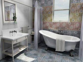 Если вы решили создать в вашей ванной комнате стиль кантри, синий цвет будет особенно уместен. Настенную плитку можно использовать теплого цвета, например, оттенка васильков. Рисунок материала может быть различным. Это могут быть классические фрагменты, каждый из которых имеет свой принт. Гораздо интереснее смотрятся панно, например размером 120 на 60 см, в которых изображена композиция определенной тематики. Это может быть природа, подводный мир, морской пляж. Для пола в таком случае стоит использовать плитку желтого цвета, что создаст успокаивающий и завораживающий интерьер.