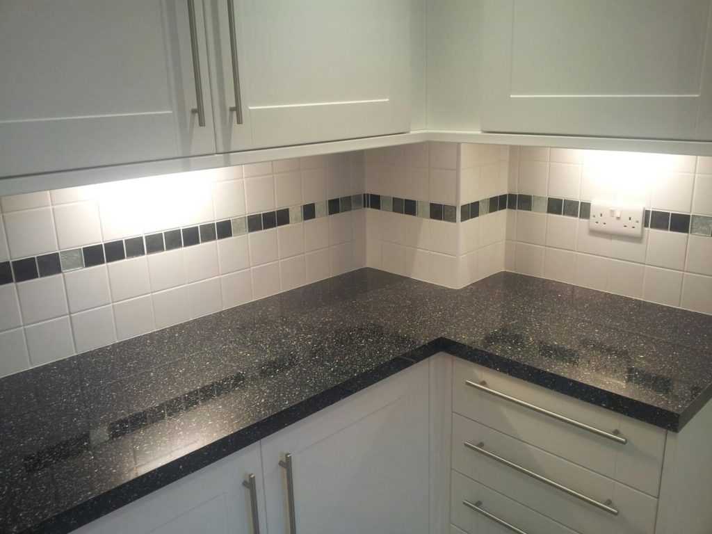 - Керамическая плитка обязательно должна немного опускаться за край столешницы, примерно на 2 см. Это предотвратит скопление грязи в стыках между столешницей и кафелем.