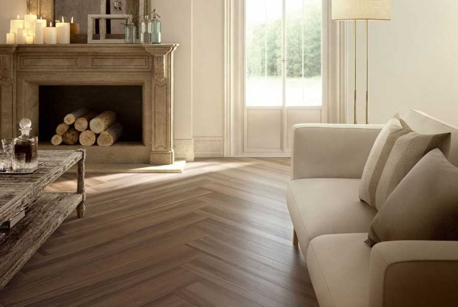 Еще одна комната, где будут всегда уместны элементы дерева — это гостиная, в особенности если в ней стоят книжные шкафы. Для гостиных выбирают как светлые, так и темные тона напольной плитки «под дерево» — в зависимости от остального интерьера. Светлый березовый или ясеневый пол поможет сделать комнату еще просторнее, а черное дерево или благородные темно-коричневые оттенки станут акцентом для изысканной мебели и аксессуаров.