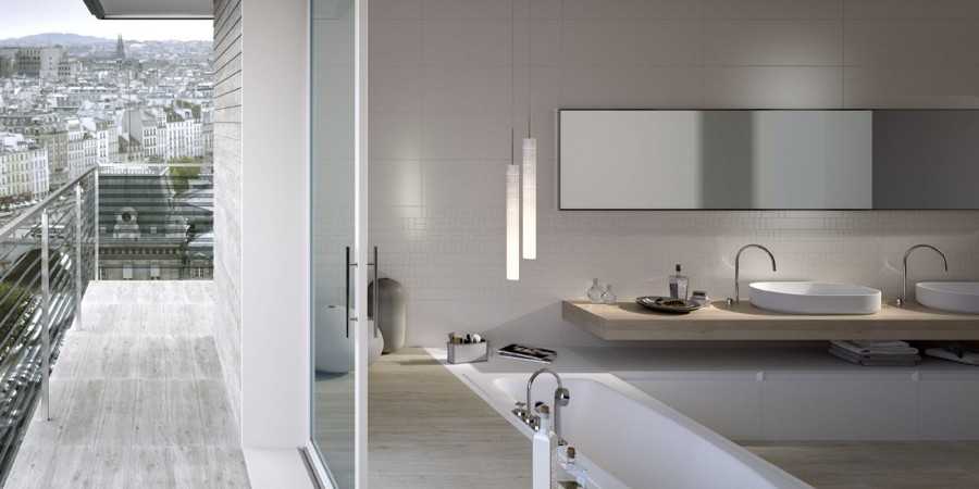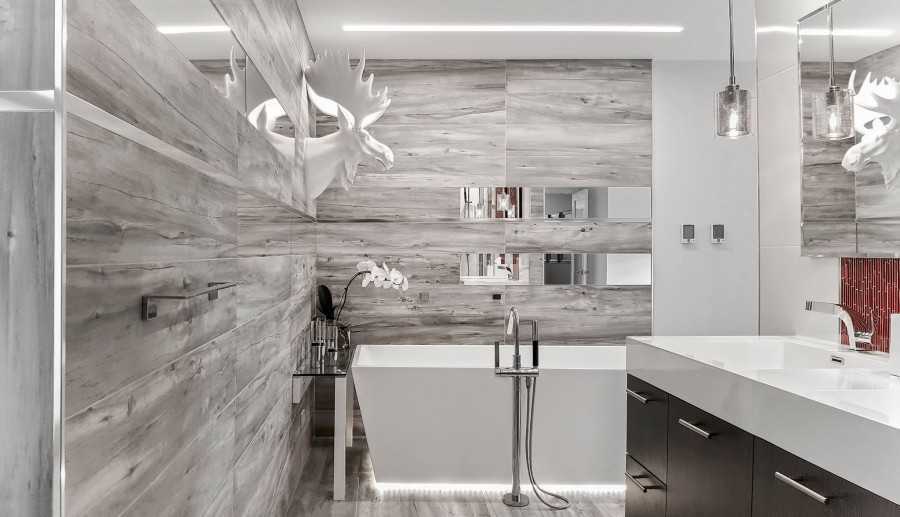 Одно из самых популярных – сочетание плитки «под дерево» и мрамора. Теплые оттенки древесины выгодно оттеняют гладкий полированный светлый камень. Шикарно выглядят и вариации на тему лофта – комбинирование облицовки ванны плиткой под дерево и бетона, пластушки, кирпича или другого необработанного натурального камня (или плитки в форме кирпича или камня).