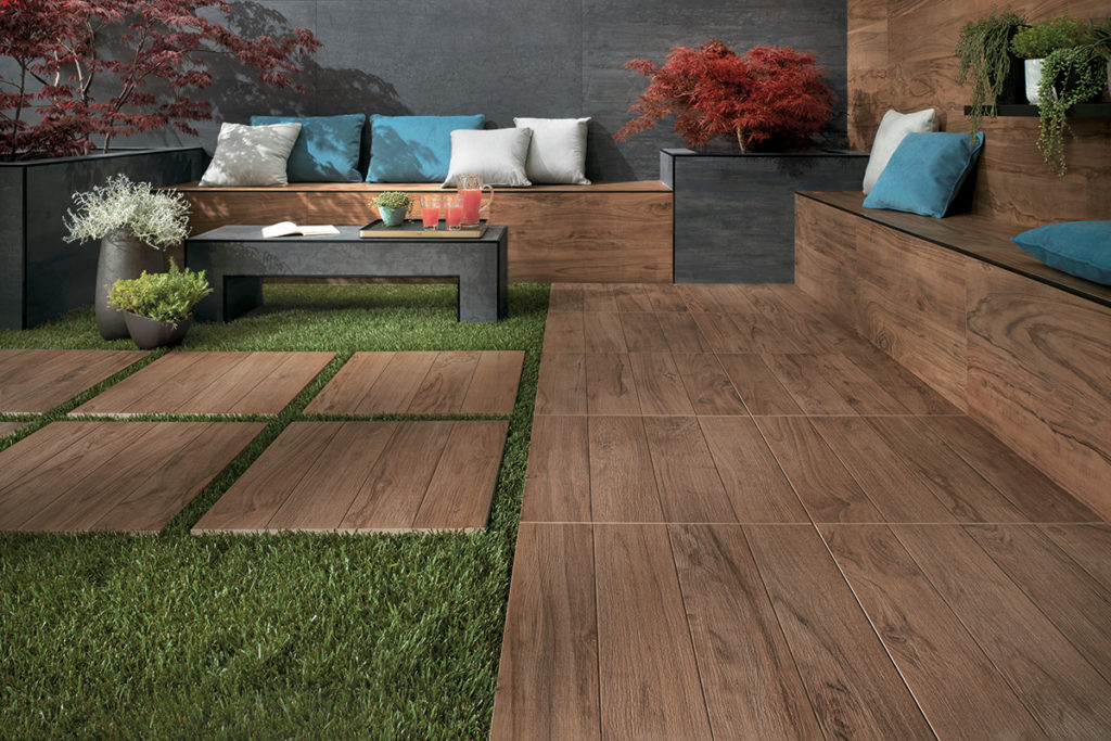 Чуть моложе, чем широкоформатные, керамогранитные плитки толщиной 2 см – для укладки снаружи без использования клея. Среди них вы также можете найти такие, которые имитируют доски – для тех, кто хочет иметь террасу, которая выглядит как деревянная, но в то же время – безопасна в использовании и не требует каких-либо специальных процедур.
