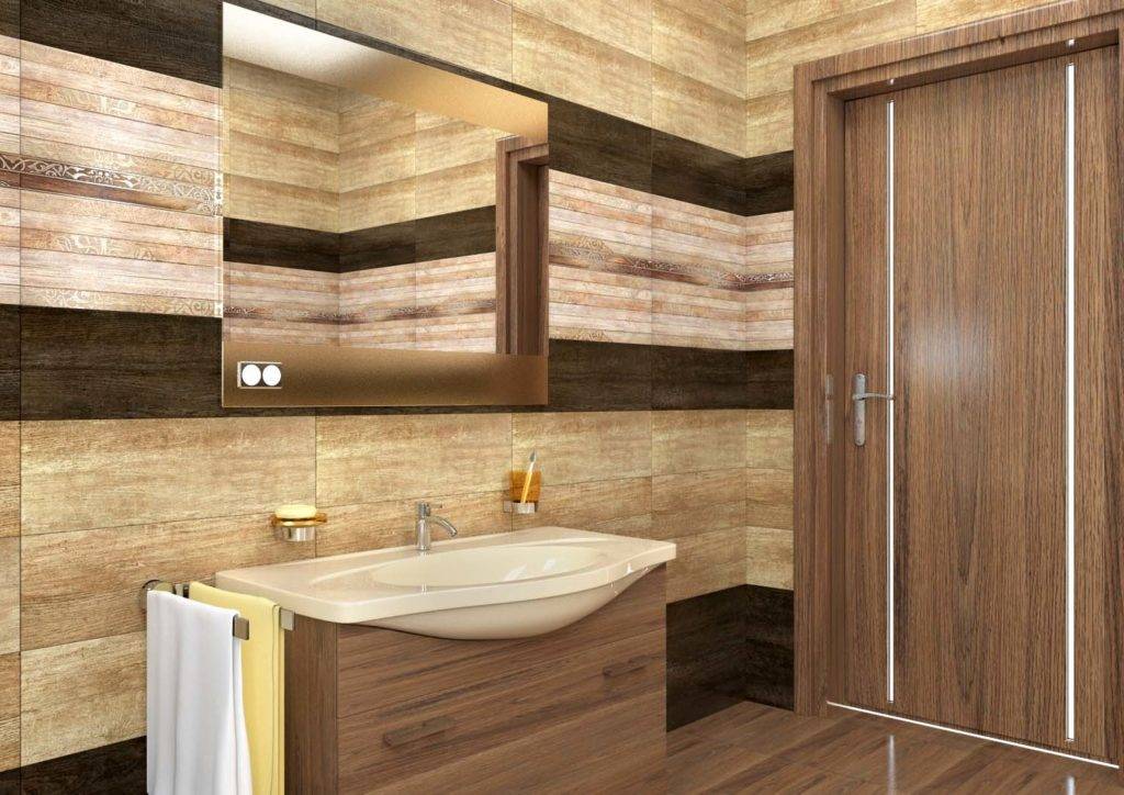 На фото плиточная керамическая отделка под дерево темного оттенка в интерьере санузла.