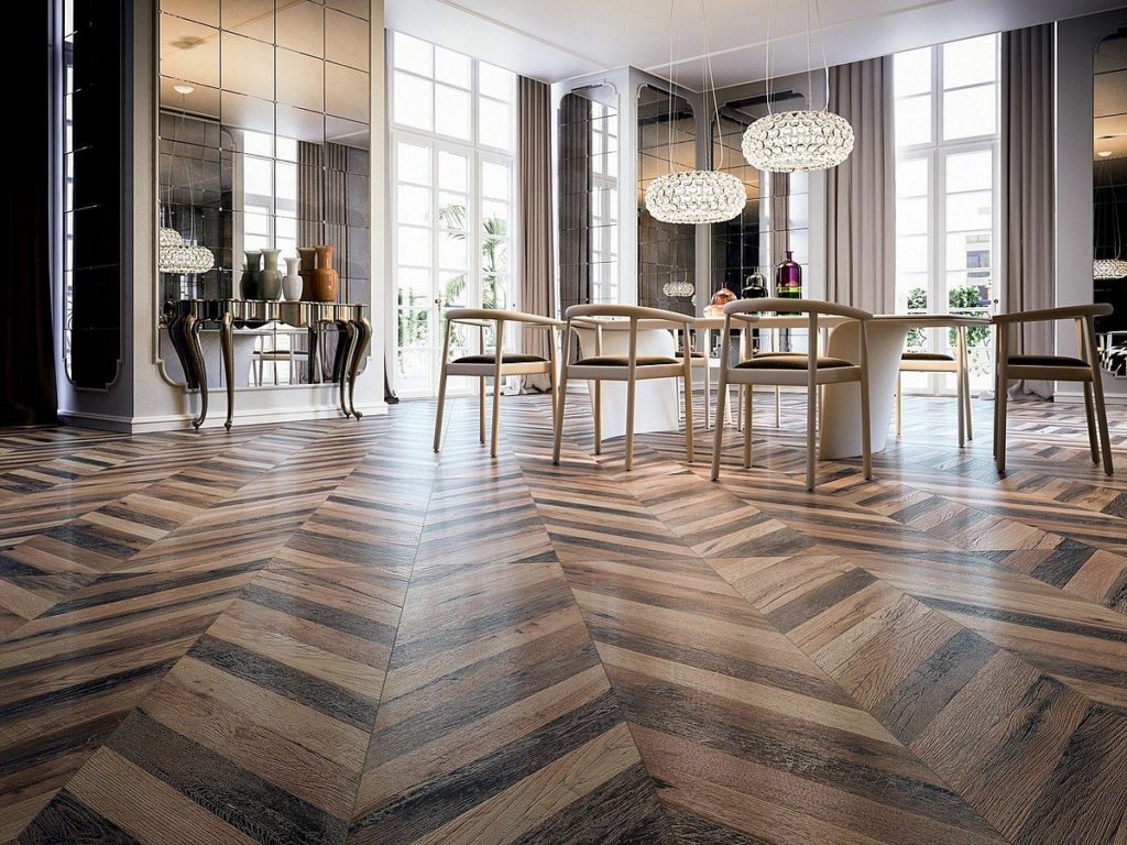 Существует множество видов плиточной укладки, среди них особенно выделяют расположение елочкой, предполагающее использование одной, двух или трех узких плиток, а также предоставляющее возможность сочетать несколько изделий с разной древесной фактурой или оттеночным решением.
