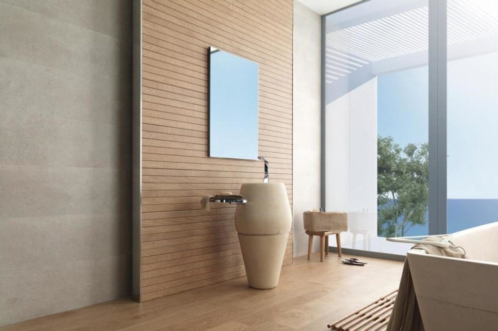 Важно правильно сочетать оттенки керамики и дерева – они не должны быть совершенно одинаковые и в то же время должны иметь совпадающую гамму оттенков – либо теплую, либо холодную.