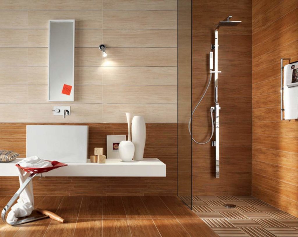 Для пола подойдет та же плитка из керамики, но только с имитацией паркета. Можно постелить и струганные доски, покрытые лаком. Однако они не прослужат слишком долго. Использование плитки с имитацией дерева могут превратить даже самую обыкновенную комнату в ванную мечты. Сочетание керамической плитки с такими элементами, как тропический душ сделает комнату яркой, стильной и интересной. К тому же она не боится влаги и плесени.