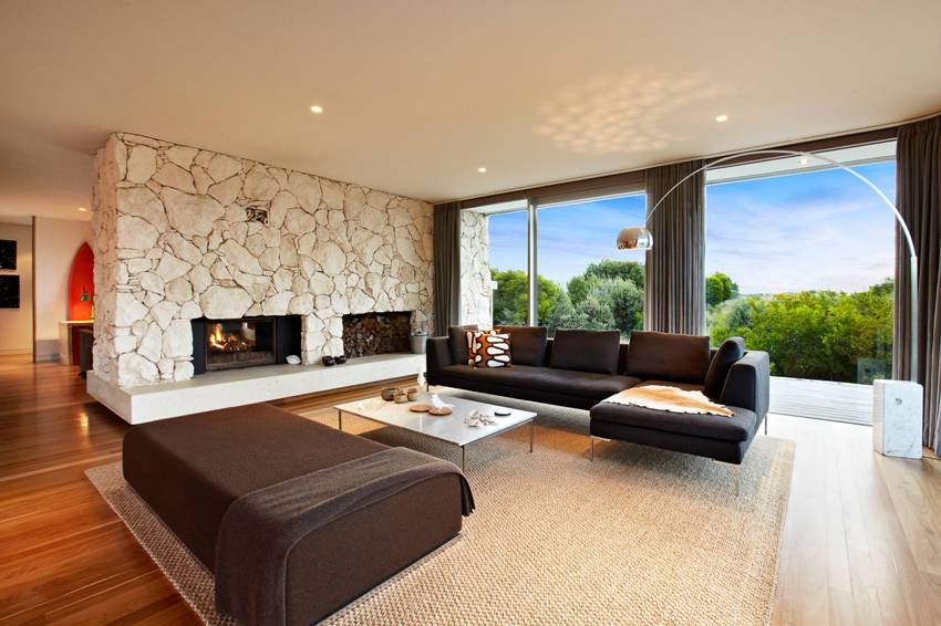 удачное сочетание камня с другими материалами. Каменная облицовка должна сочетаться с текстурой стен, потолка и пола. Также к камню гармонично должны быть подобраны двери, окна, плинтуса, мебель и аксессуары;