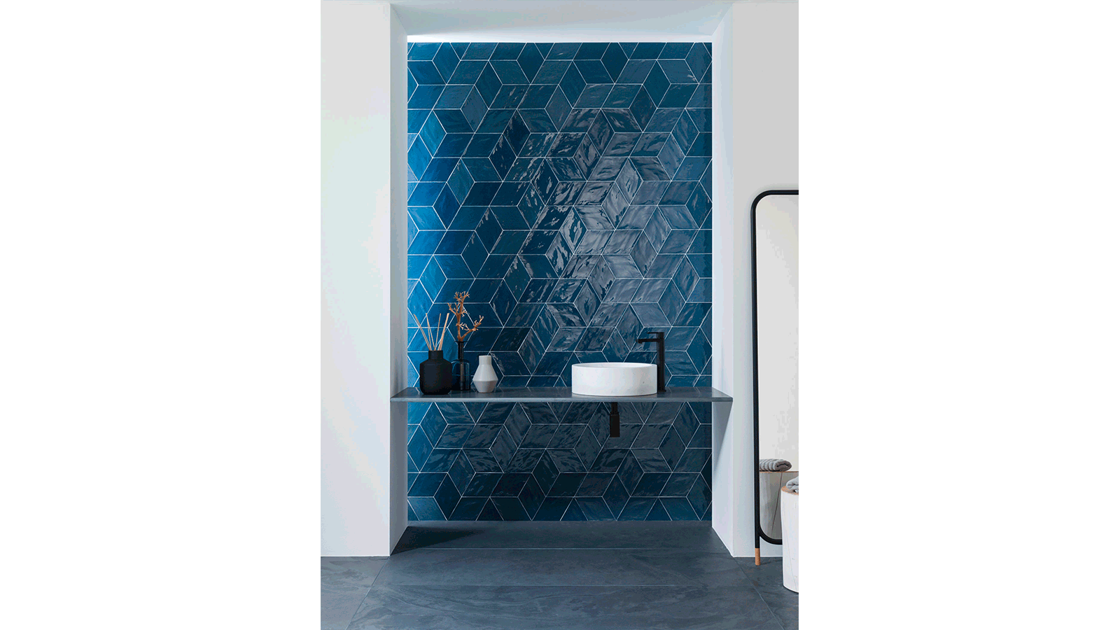 Керамическая плитка Rhombus Navy, сланец Patagonia Home и раковина Navona Persian White от L’Antic Colonial