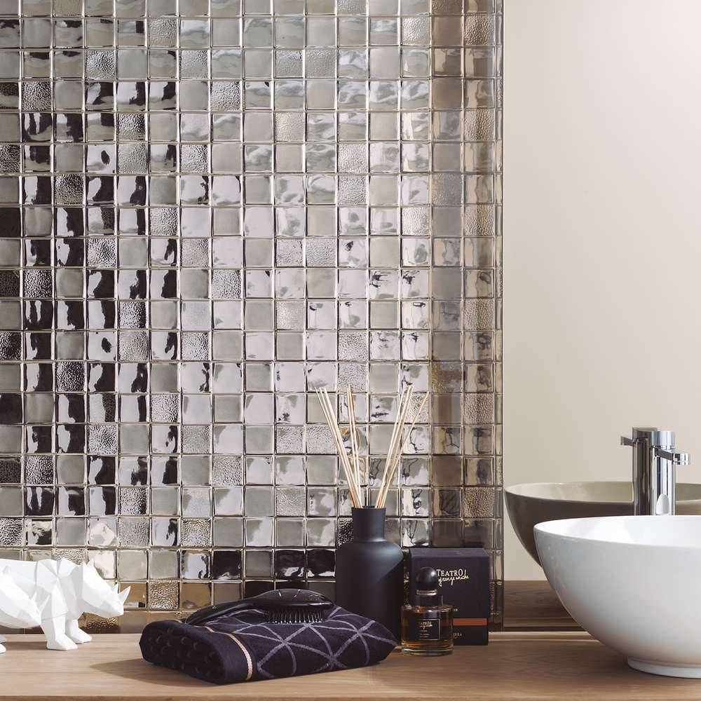 - Новый трэнд – плитка с металлическим напылением. С помощью нее можно смоделировать оригинальный интерьер в небольшой кухни, ванной комнате благодаря способности зрительно увеличивать пространство;