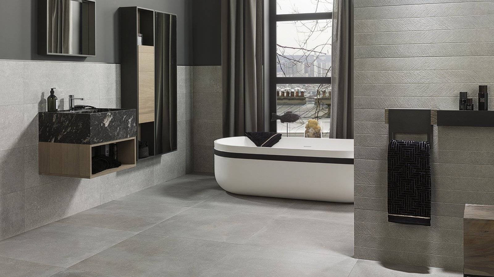 Urbatek – напольная плитка широких форматов, обладающая повышенной устойчивостью к любым воздействиям, в том числе химическим. Подойдет для укладки полов в коммерческих помещениях: складских зонах, спа-комплексах. Цветовая палитра неброская: имеет серый, черный и молочный оттенок.