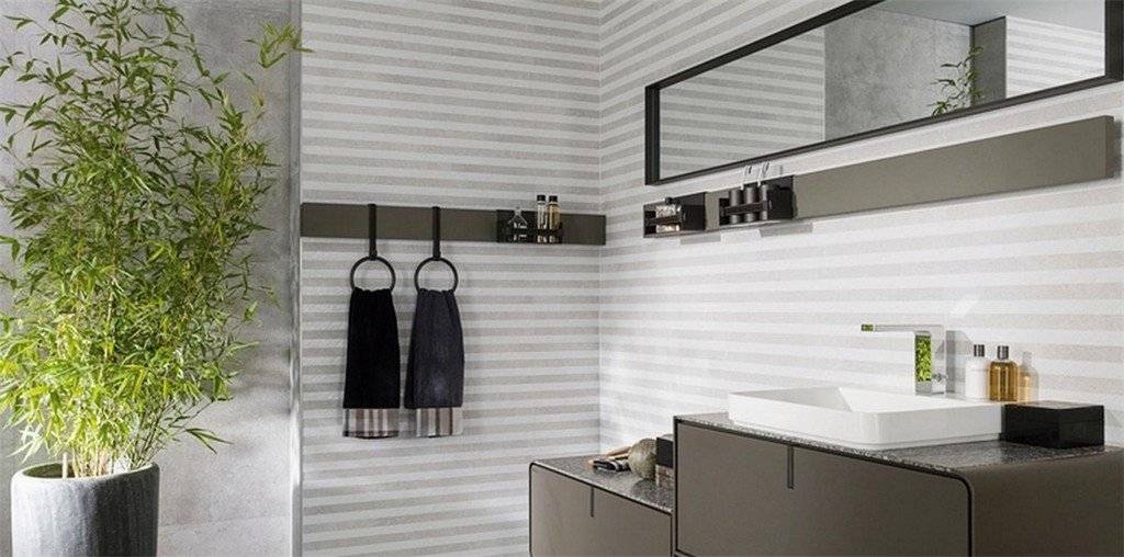 В зависимости от типа помещения и его размеров можно поиграть с вертикальными или горизонтальными полосами. Если комната широкая, то визуально удлинить ее можно вертикальной полосой, при этом использовать несколько контрастных цветов, сделав яркий акцент. Горизонтальная полоса – расширит пространство, особенно если выбрать светлый цвет с объемной фактурой на фоне гладкой плитки в более темной цветовой гамме.