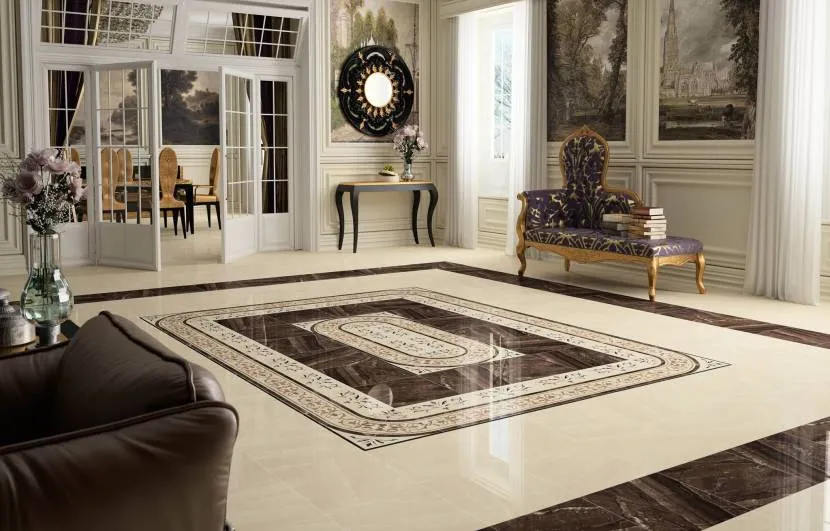 Из практических соображений такую плитку, а она продается именно комплектом (крупные + мелкие элементы), можно использовать в холлах (меньше заметен случайный мусор, чем на однотонной) и в качестве локальных вставок для больших комнат. Для маленьких предпочтительна менее контрастная.