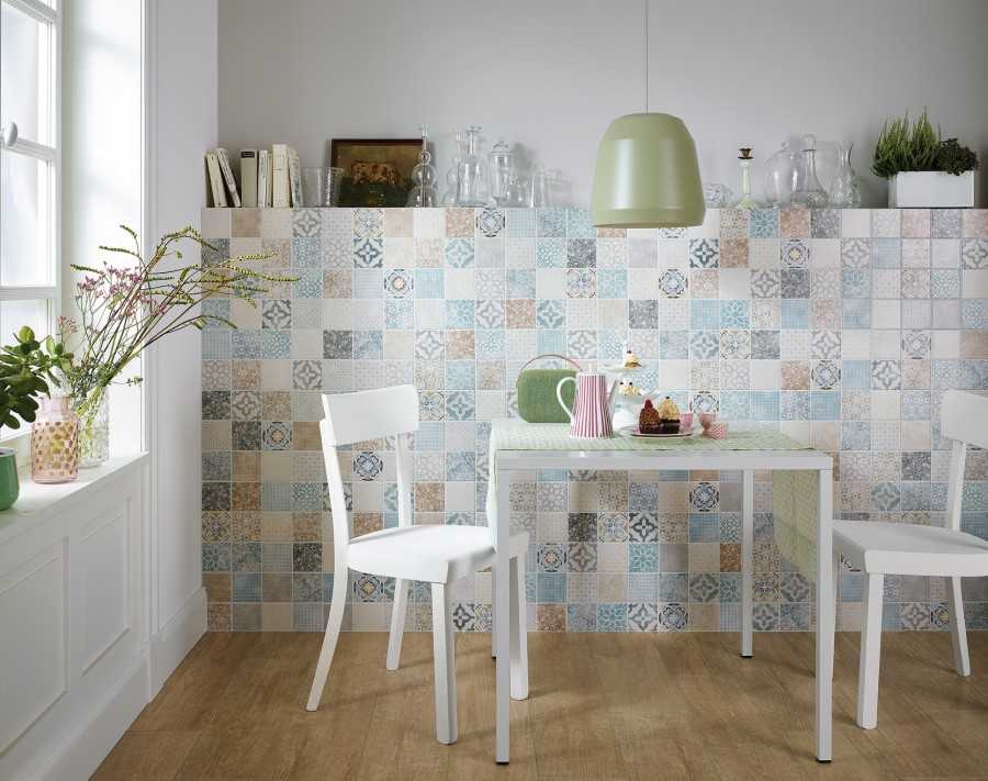 Варианты под мозаику или пэчворк применяют в виде акцента, уж очень они оттягивают на себя внимание; дополнением служит однотонный материал. Узорчатая плитка подойдет для деревенских стилей, а также для интерьеров с примесью эклектики или этно