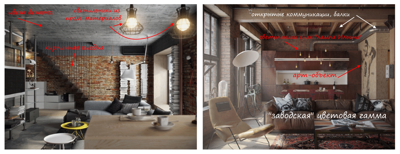 - Визуальное отсутствие отделки стен и потолков – они должны быть кирпичными, деревянными, бетонными, могут иметь элементы в виде грубой штукатурки;