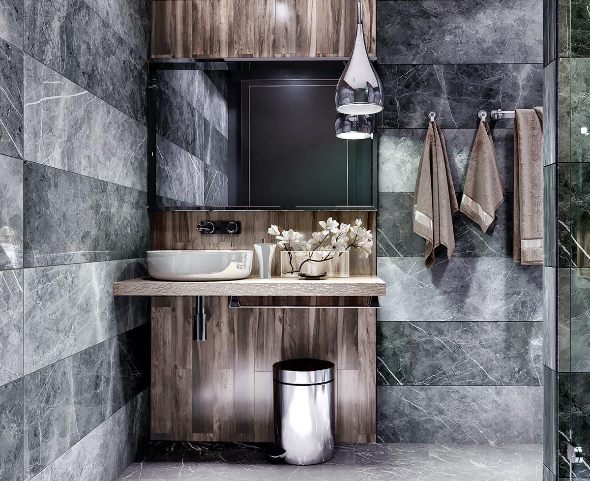 Придать интерьеру модной «натуральности» можно при помощи имитации натурального камня, тем более, что такая модная керамическая плитка 2021 отлично сочетается с хромированной сталью и стеклом.