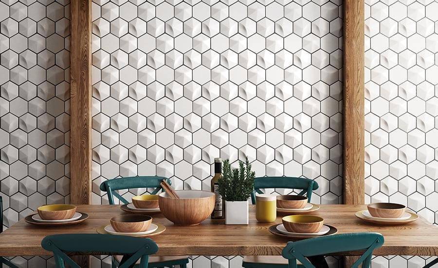 Даже наиболее незамысловатый орнамент – скажем, кирпичики, простая мозаика, стилизация рыбной чешуи или пчелиных сот в 3D-формате смотрится просто потрясающе. Строжайшие пропорции и тонкие, изящно выведенные линии — демонстрация хорошего вкуса, так как геометрия по прежнему в тренде.